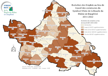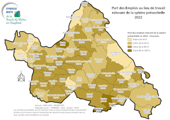 Les cartes ci-dessous montrent les évolutions relatives au nombre d’emplois dits “au lieu de travail” entre 2010 et 2022, c’est à dire le nombre d’emplois présents dans la commune. La dernière carte indique le nombre de ces emplois qui relèvent de l’économie présentielle (commerces et services locaux (boulangerie, agence bancaire, activités consommées localement). Un chiffre peu élevé indique généralement une part importante d’emplois liés à des activités consommées hors de la commune (industries, services B2B…)