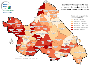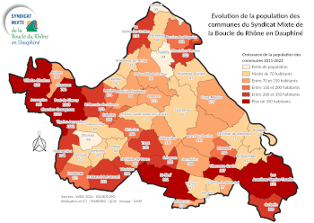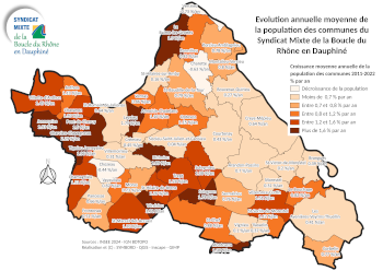 Les cartes ci-dessous montrent les évolutions relatives à la population entre 2010 et 2022, en nombre, en pourcentage et en croissance annuelle.